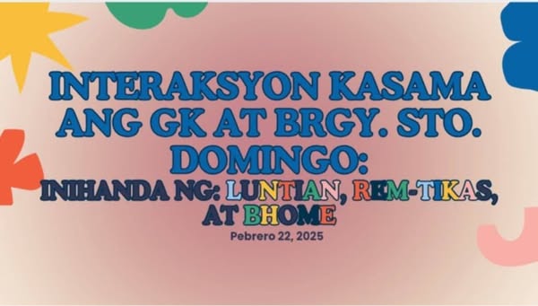 Interaksyon kasama ang GK at Sto. DomingoFeb 221 min readSTCQC SHS KABALIKATAN Organization: Rem-Tikas, Luntian, and BHome Interaction with the Elderly and Nanay/Tatay of Gawad Kalinga Sto. Domingo (GK-STC) - Feb 22, 2025